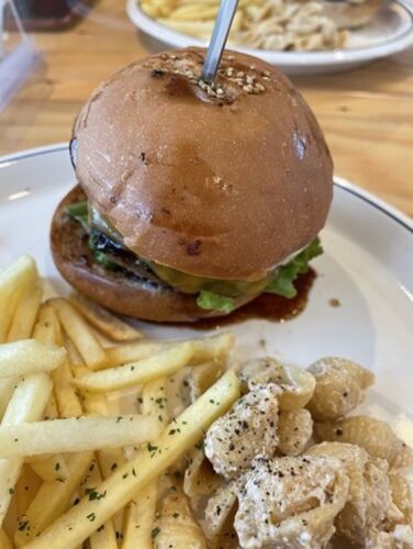 一宮町のレストランで遅めの昼食 グリルフィッシュバーガーはボリューミーで、食べると手がベタベタ。 お腹ペコペコだったので、味が身体に染み渡りました。 このお店、おしゃれな内装はコワーキングスペースとしても機能しているみたい。 朝一にサーフィン…